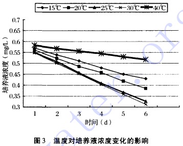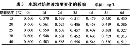 由于水溫隨氣溫的變化而變化,因此有必要研究水溫對植物消除技術(shù)的影響。根據(jù)本地氣候特點,分別用5臺恒溫培養(yǎng)箱設(shè)置5種假想水溫:15℃、20℃、30℃、40℃。每天固定時間取樣分析,連續(xù)6d,所得結(jié)果見表3。