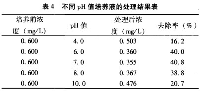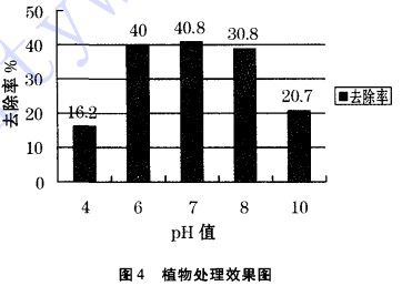 由于廢水的pH值變化范圍較大,必須根據(jù)試驗結(jié)果來確定植物消除技術(shù)最適宜的pH值范圍。在5個濃度為0.60mg/L的培養(yǎng)缸中加入一定量的酸和堿,調(diào)節(jié)培養(yǎng)液的pH值分別為4.0、6.0、7.0、8.0、10.0,植入植物,5d后取水樣進行分析,測定結(jié)果見表4。表4不同pH值培養(yǎng)液的處理結(jié)果表2數(shù)據(jù)分析與討論
