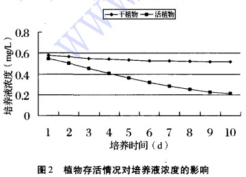 (2)根據(jù)表2繪制分析圖見圖2。只有活體植物才能有效地從水中富集即去除重金屬,從而使溶液中的鉻濃度降低。而干植物開始時由于表面吸附而能迅速地吸收溶液中的鉻而使?jié)舛冉档,后來由于一些非生物學(xué)的離子交換及平衡過程而使溶液中的鉻維持在一定水平上。隨著植株的生長,溶液中的鉻將不斷地被植物體所富集,最終會降低溶液中鉻的濃度從而起到凈化水質(zhì)的目的。