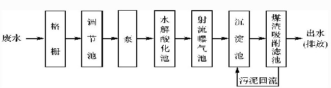 該廠采用水解酸化—射流曝氣—煤渣吸附工藝處理廢水,其工藝流程見(jiàn)圖2。