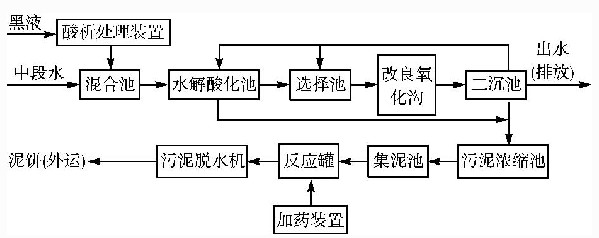 寧夏沙湖紙業(yè)有限公司產(chǎn)紙量為35 000 t / a,該廠廢水主要來(lái)源于制漿和造紙工藝中的擠漿、洗漿和漂白等工段,廢水種類(lèi)包括黑液、中段水、白水和板紙廢水。其中黑液排放量為1 500 m3 / d, 其它廢水合并進(jìn)入中段水處理系統(tǒng), 其排放量為18 500m3 / d。該廠綜合廢水處理工藝流程如圖3所示。作為好氧生物處理單元的氧化溝, 采用先進(jìn)的供氣式低壓射流曝氣系統(tǒng)供氧。該系統(tǒng)將氧化溝中的混合液用混合泵打入安裝在溝底的射流曝氣器,并在射流曝氣器的混合室與鼓風(fēng)機(jī)壓入的空氣混