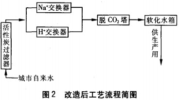 針對(duì)軟化水系統(tǒng)出現(xiàn)的問(wèn)題及成因,需對(duì)原水進(jìn)行預(yù)處理。采用活性炭過(guò)濾技術(shù)可以去除原水中的有機(jī)物及細(xì)小勃土顆粒,消除其對(duì)離子交換樹(shù)脂的影響。在軟化水系統(tǒng)前設(shè)置4臺(tái)φ3m的活性炭過(guò)濾器(Q=70m3/h)。原水經(jīng)活性炭過(guò)濾器后,其出水濁度及高錳酸鹽指數(shù)均為零,可見(jiàn)活性炭對(duì)原水中的有機(jī)物及細(xì)小勃土顆粒具有較好的去除效果。改造后“山鋁”軟化水站的工藝流程如圖2所示。