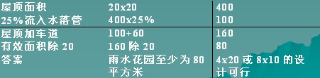 這是一座20x20米的別墅,估計25%的雨水將從屋頂流入水落管后排出。另外車道面積約為60平方米。若設計一個土壤深度為15厘米的雨水花園,花園的面積設計: