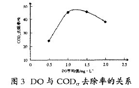 由圖可知,SBR溶解氧平均控制在1.0~1.5mg/L左右時(shí),COD。 的去除率較高,經(jīng)過(guò)3h反應(yīng)出水為560mg/L,反應(yīng)器中45% 的有機(jī)物得到了去除,反應(yīng)中未檢測(cè)出NO-,較高的有機(jī)含量和低溶解氧抑制了硝化反應(yīng)的發(fā)生。DO>2mg/L,容易發(fā)生硝化反應(yīng),COD 去除率降低,說(shuō)明再增加溶解氧在較短的時(shí)間內(nèi)并不能有效地提高去除率,而且以完全好氧方式,亦增加能耗和運(yùn)行費(fèi)用。當(dāng)DO<O.5mg/L時(shí),由于DO不足,抑制了細(xì)菌正常的代謝活動(dòng)此時(shí)微生物不甚活躍,出水混濁。