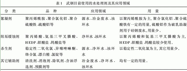 武鋼作為國內(nèi)特大型的鋼鐵聯(lián)合企業(yè),從采 礦到軋鋼的每一個(gè)環(huán)節(jié)都離不開水,工業(yè)循環(huán)冷 卻水、冶煉廢水只有經(jīng)過水處理劑的處理才能減 少在使用過程中產(chǎn)生的腐蝕、結(jié)垢及菌藻滋生等 多種危害,避免對自然界水體的污染。武鋼水處 理藥劑的用量相當(dāng)大,費(fèi)用從2001年的1 265.79 萬元上升到2004年的3 824.31萬元,到2005年 已接近5 000萬元。目前使用的水處理劑及其應(yīng) 用領(lǐng)域如表1。