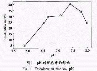 pH=7.42時,PAC對染料廢水具有最佳的脫色效果?梢酝茰y在ll~pH條件下,更有利于膠體的脫穩(wěn),聚沉。因此,在后續(xù)實驗中均預先將呈弱酸性的模擬廢水的pH調(diào)節(jié)至7.42。