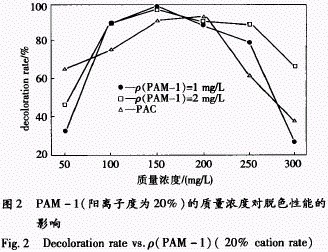 (1)將陽離子型PAM與PAC復合用于印染廢水的脫色處理,可達到接近100% 的處理效果。加人P(PAM)=1mg/L可將PAC的用量從150 mg/L減少至100 mg/L。