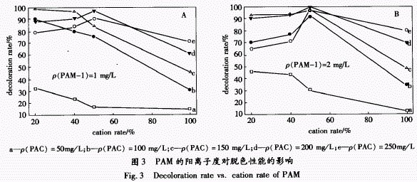 (2)在不同的PAC質量濃度條件下,脫色性能與PAM陽離子度的關系呈現(xiàn)不同的變化規(guī)律。PAM 陽離子度為50% 時,脫色率可達到90% 以上,過多的陽離子會導致膠體顆粒重新穩(wěn)定。