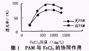 圖1中系列1為只加~eCl3的處理效果,系列2為FeCl3與PAM協(xié)同作用的效果,可見FeCl3與PAM協(xié)同作用的處理效果要比單獨使用FeCl3的處理效果好(出水透光率普遍提高),且可觀察到絮體顆粒大,沉降速度快,沉降后污泥體積小。