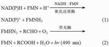 細(xì)菌發(fā)光反應(yīng)主要參與的物質(zhì)包括熒光酶、 FMN、NAD(P)H、長鏈脂肪醛(RCHO)、分子氧等。 在熒光酶的作用下, FMNH2 和RCHO 被O2 氧化, 產(chǎn) 生的能量并不被生物體儲存, 而是通過光的形式釋 放出來, 其反應(yīng)式如下: