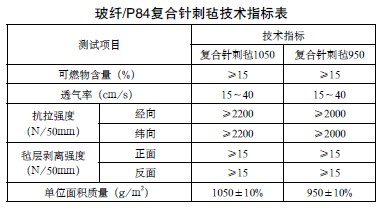 經(jīng)過批量生產(chǎn)及性能跟蹤檢測(cè),玻纖/P84復(fù)合針刺氈技術(shù)指標(biāo)如下表。