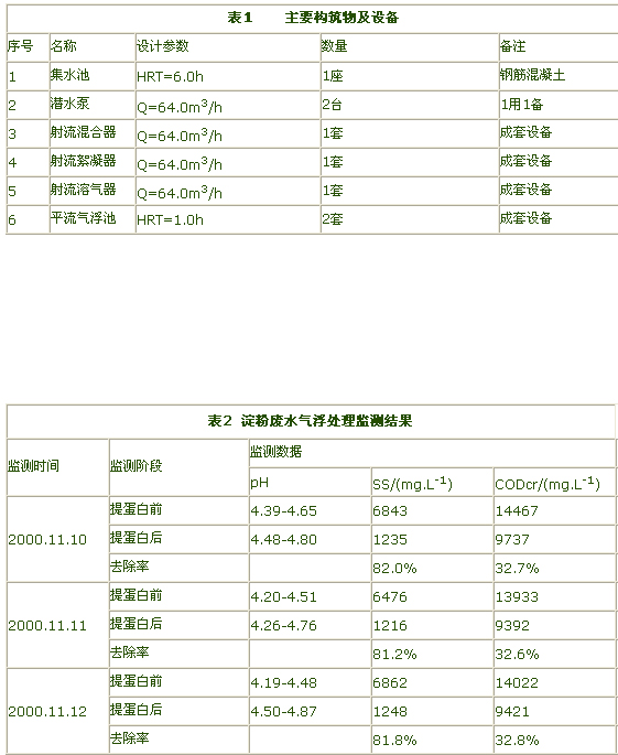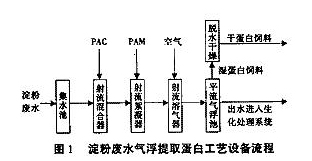 采用沉淀法從淀粉廢水中提取蛋白,沉淀性能差,特別是夏天,由于有機(jī)物腐敗更不容易沉淀而且產(chǎn)品質(zhì)量差。采用氣浮法從淀粉廢水中提取蛋白能夠獲得較好的效果,氣浮法與沉淀法相比具有以下優(yōu)點(diǎn):可以實(shí)現(xiàn)連續(xù)化生產(chǎn)而且容易實(shí)現(xiàn)自動(dòng)控制,得到的蛋白絮體含水量較小對(duì)后續(xù)的脫水與烘干有利,操作簡(jiǎn)單,運(yùn)行穩(wěn)定。