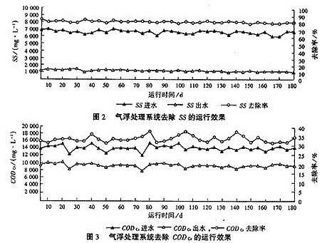 工程穩(wěn)定運(yùn)行期間進(jìn)行了每天3次連續(xù)3d的監(jiān)測(cè),監(jiān)測(cè)結(jié)果見(jiàn)表2。2001年4月~2001年9月本處理系統(tǒng)的運(yùn)行效果見(jiàn)圖2和圖3。本廢水處理系統(tǒng)在運(yùn)行過(guò)程中每噸廢水提取粗蛋白含量為35%左右的玉米蛋白飼料5.0kg,每天可以提取玉米蛋白飼料7.6t。