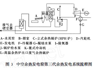 (3)第三代技術——中國結合預分解窯余熱發(fā)電技術及設備而開發(fā)、研制的中空余熱發(fā)電窯余熱發(fā)電系統(tǒng),如圖3所示。