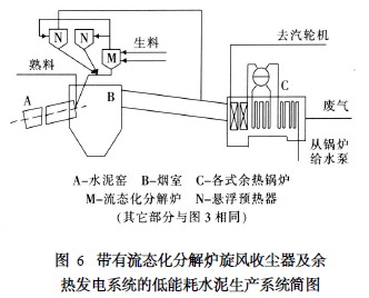 對(duì)于預(yù)熱器窯,當(dāng)不改變余熱發(fā)電系統(tǒng)的技術(shù)指標(biāo)與預(yù)分解窯相同;為了進(jìn)一步降低生產(chǎn)能耗、提高水泥熟料產(chǎn)量,采用預(yù)分解技術(shù)及余熱發(fā)電技術(shù)對(duì)預(yù)熱器窯進(jìn)行改造,形成了帶有流態(tài)化分解爐、旋風(fēng)收塵器(或二級(jí)預(yù)熱器)及余熱發(fā)電系統(tǒng)的低能耗水泥生產(chǎn)系統(tǒng),如圖6所示。