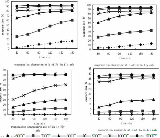 試驗中對垃圾飛灰熱處理時重金屬的蒸發(fā)特性進行了分析,結(jié)果發(fā)現(xiàn)飛灰熱處理時,重金屬的蒸發(fā)率較高,尤其在900℃以上,而試驗研究同樣發(fā)現(xiàn)1000℃以上,飛灰中二惡英的分解率在90%以上。由此看來,利用垃圾飛灰制作水泥其毒性大大減小,但應(yīng)做好對蒸發(fā)物的回收,減小熱處理過程中的二次污染,同時回收物可以進一步提存再利用。