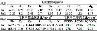 表1中給出國內(nèi)兩種典型的垃圾焚燒爐產(chǎn)生飛灰的構(gòu)成及污染物含量情況。