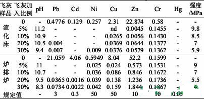 垃圾飛灰與燃煤飛灰在組成上極為相近,與水混合后自身存在一定的凝硬特性,垃圾飛灰與水泥混合,不僅產(chǎn)生一定的硬度滿足路基材料的需求,同時水泥的水化產(chǎn)物及堿性環(huán)境還可以抑制重金屬的滲濾,滿足環(huán)保的要求,因此可以用垃圾飛灰作為路基、堤壩、建筑材料及瀝青細骨料。實驗中分別采用爐排爐和流化床兩種垃圾焚燒爐飛灰并與水泥、水在一定比例下充分混合均勻,制成試件在一定條件下養(yǎng)護4周,測試試件的強度,并利用TCLP1311測試其重金屬的滲濾特性。實驗分,試驗結(jié)果見表2。