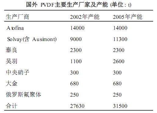 2000~2006年的年均消費增長率為 4% , 2003 年全世界消費量 2 . 2萬噸 , 2005年全球 PVDF的消 費量達到 2 . 5萬噸以上。