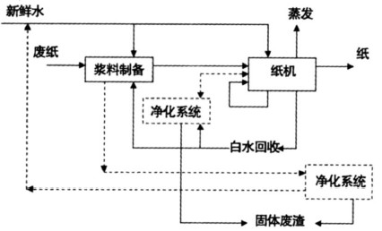 造紙用水封閉循環(huán)就是在造紙過程中連續(xù)大量循環(huán)使用白水的基礎(chǔ)上,用有效的方式處理過剩的白水和廢水,把白水中的固體懸浮物(細(xì)小纖維、填料) 、溶解物質(zhì)和膠體物質(zhì)的含量降低到生產(chǎn)過程中允許的使用范圍內(nèi),代替新鮮水循環(huán)使用,對于必須排放的廢水也應(yīng)經(jīng)相關(guān)系統(tǒng)處理后符合排放標(biāo)準(zhǔn)才能排放。與此 同時,還應(yīng)把回收的固體物料輸送到本系統(tǒng)或其他的造紙系統(tǒng)使用,以達(dá)到節(jié)約用水、回收纖維、填料、化學(xué)藥品和熱量、較低廢水排放量和減少環(huán)境污染的目的 。具有凈化處理的封閉系統(tǒng)如圖所示。