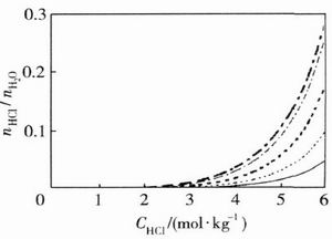 因為鹽酸有共沸點,按常規(guī)理解似乎不可能回 收濃的鹽酸,但考慮到RECl3的鹽析效應,首先從 理論上計算了含SmCl3的鹽酸體系中水及HCl的 分壓,發(fā)現(xiàn)相對于純鹽酸溶液而言,同條件下,由于 SmCl3存在,導致溶液體系H2O分壓減小,而HCl 分壓增大,而且隨SmCl3濃度增大,H2O分壓的減 小及HCl分壓增大趨勢更為明顯.圖4為根據(jù)計算 結(jié)果作出的氣液平衡關系圖.