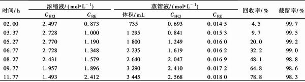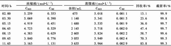 試驗中稀土反萃液CRE=0.6~0.9 mol/L, CHCl=2~2.5 mol/L,重稀土反萃液:CRE=0.2~ 0.4 mol/L,CHCl=4.5~5.5 mol/L,每次用料液 5 L,料液溫度62~63℃,冷側(cè)壓力8~10 kPa,料液 循環(huán)速度5.4 cm/s.
