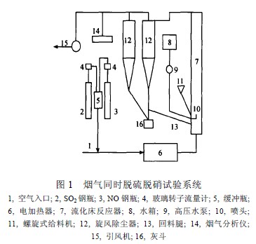 試驗(yàn)中使用SO2-NO-H2O-空氣混合氣體來(lái)模擬實(shí)際煙氣, SO2 和NO 來(lái)自于各自的鋼瓶. 該混合氣體經(jīng)電加熱器加熱后進(jìn)入流化床反應(yīng)器. 本實(shí)驗(yàn)系統(tǒng)使用引風(fēng)機(jī)作動(dòng)力來(lái)源, 實(shí)驗(yàn)系統(tǒng)在負(fù)壓下運(yùn)行. 床內(nèi)運(yùn)行壓降800 Pa.