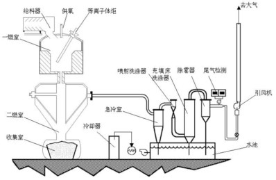 ![]() 1-廢物進(jìn)料;2-豎爐;3-熔爐;4-融渣收集;5-等離子體炬;6-門;7-尾氣出口 |